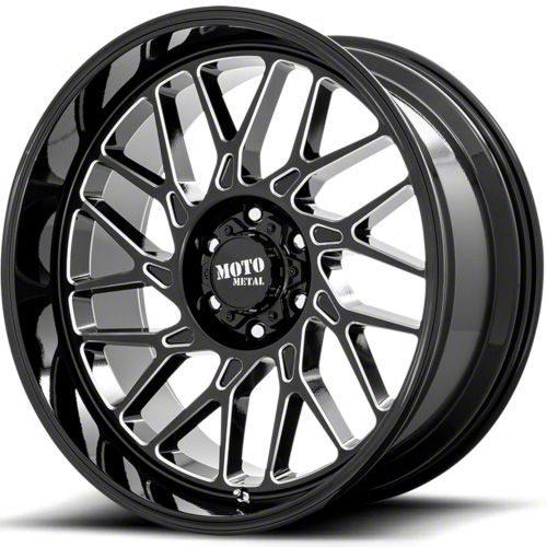This 20x10 Moto Metal MO805 Gloss Black Milled 6-Lug Wheel is completed in a high-quality gloss black finish with steel milled accents that will make the wheel the envy of everyone. There is a durable clear coat that protects against driving hazards.One-Piece Cast Aluminum Construction. This wheel is manufactured using gravity casting. Gravity casting is the process of pouring a molten aluminum alloy into a wheel mold or form utilizing the earth's own gravity to help fill the mold. The result is a strong, durable wheel that has the same good looks as a more expensive wheel, at a fraction of the price.
