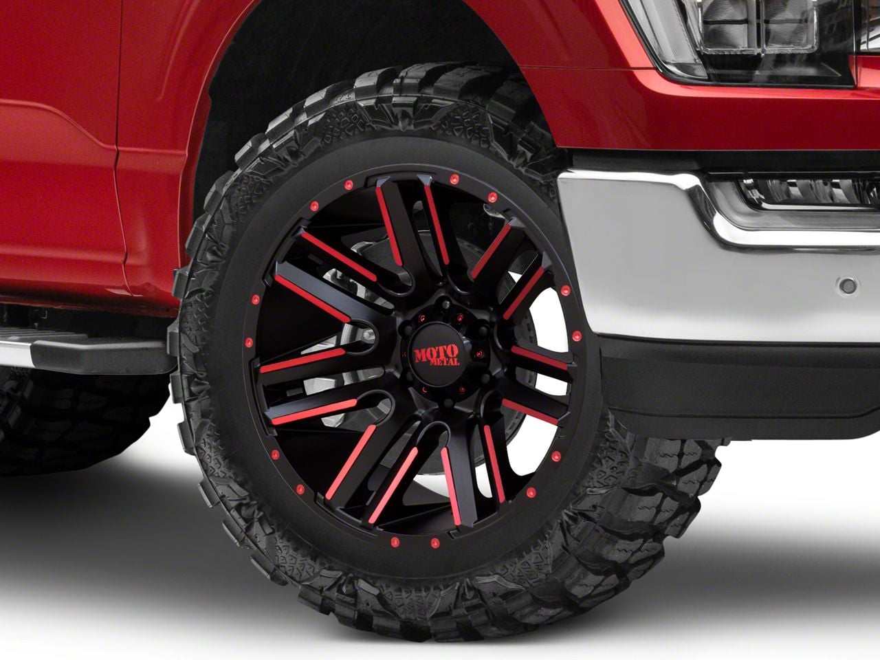 Application. This Moto Metal Razor Satin Black Machined Red Tint 6-Lug Wheel; 20x10; -24mm Offset with a backspace of 4.556 Inch, 115.8mm; and bolt pattern of 6 x 135mm (6 x 5.31-Inch), contributes to alignment, driving stability, and ensures a perfect fit with the vehicle model. Designed to fit the 2021-2026 F-150. Sold individually.