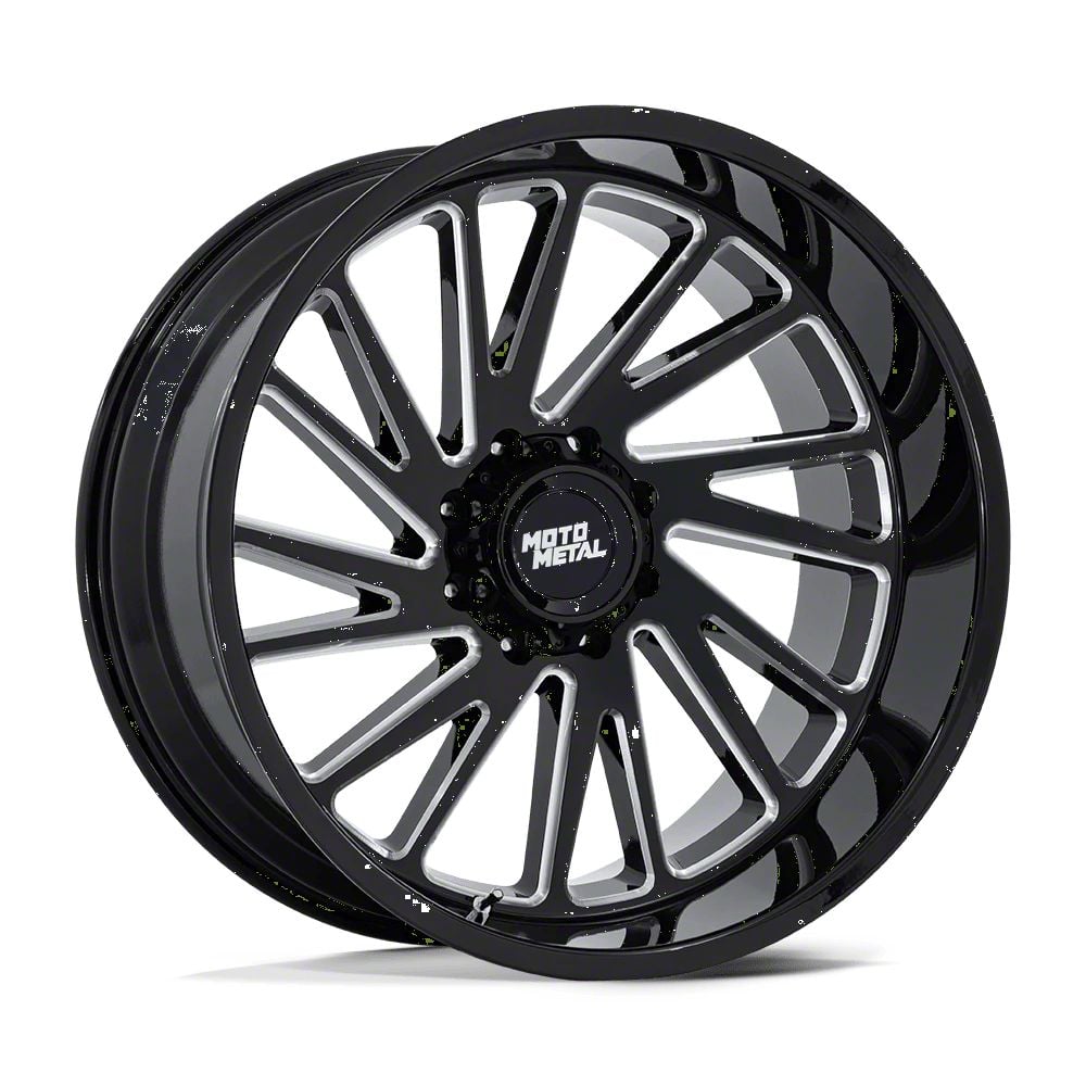 Moto Metal Combat Gloss Black Milled 8-Lug Wheel; 22x12; -44mm Offset The Moto Metal Combat Gloss Black Milled 8-Lug Wheel combines a sleek, sophisticated design with premium construction that enhances the visual appeal and complements a wide range of vehicle styles. This wheel is perfect for those seeking to make a bold statement while maintaining elegance and robustness.