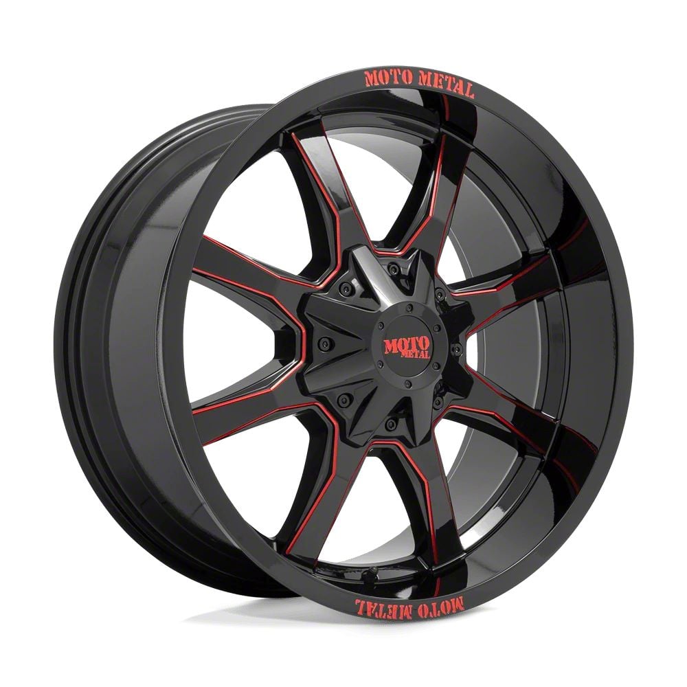 Moto Metal MO970 Gloss Black Milled with Red Tint and Moto Metal On Lip 8-Lug Wheel; 20x10; -18mm Offset The Moto Metal MO970 Gloss Black Milled with Red Tint and Moto Metal On Lip 8-Lug Wheel combines a sleek, sophisticated design with premium construction that enhances the visual appeal and complements a wide range of vehicle styles. This wheel is perfect for those seeking to make a bold statement while maintaining elegance and robustness.