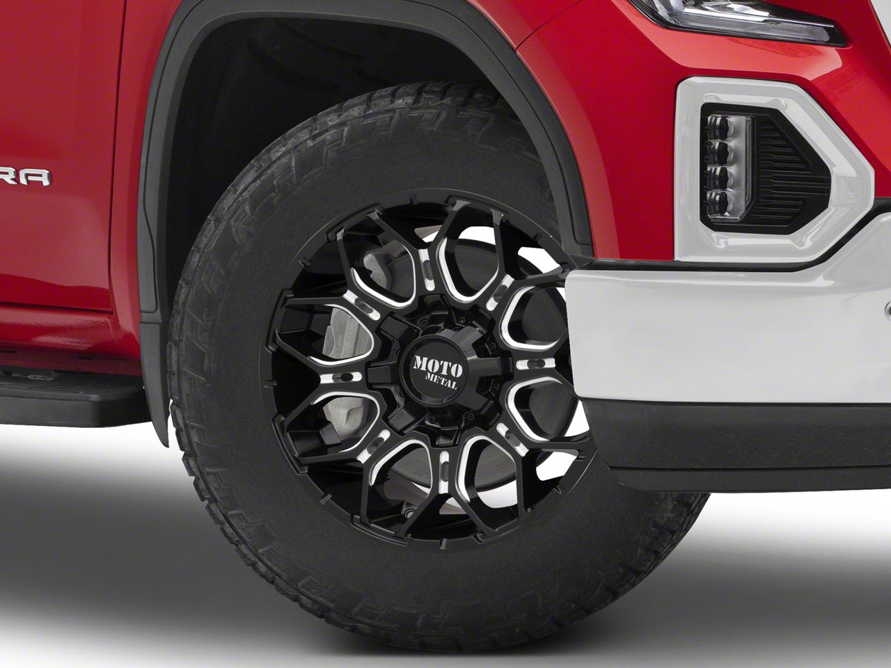 Application. This Moto Metal MO808 Sniper Gloss Black Milled 6-Lug Wheel; 20x10; -18mm Offset, with a backspace of 4.792 Inch, 121.8mm; and bolt pattern of 6 x 139.7mm (6 x 5.5-Inch), ensures precise alignment and unwavering stability. Designed to fit the 2019-2026 Sierra 1500 models, it stands out as a tailored enhancement. Sold individually.