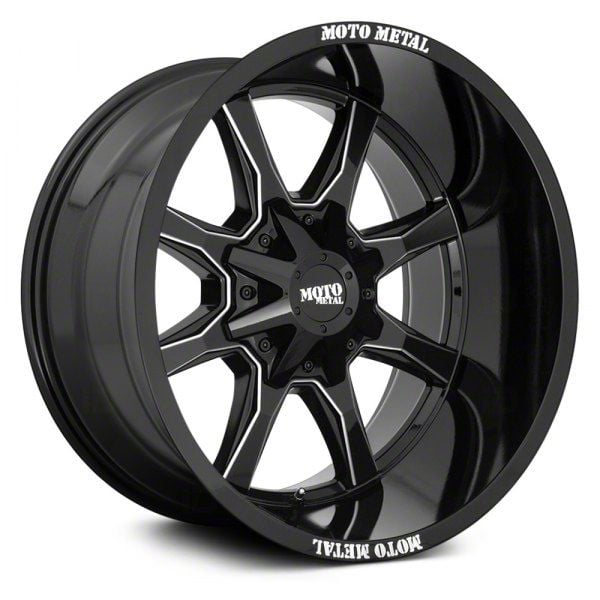 This 20x9 Moto Metal MO970 Gloss Black Milled 8-Lug Wheel is completed in a high-quality gloss black finish with steel milled accents that will create a striking appearance. There's a durable clear coat that protects against driving hazards.