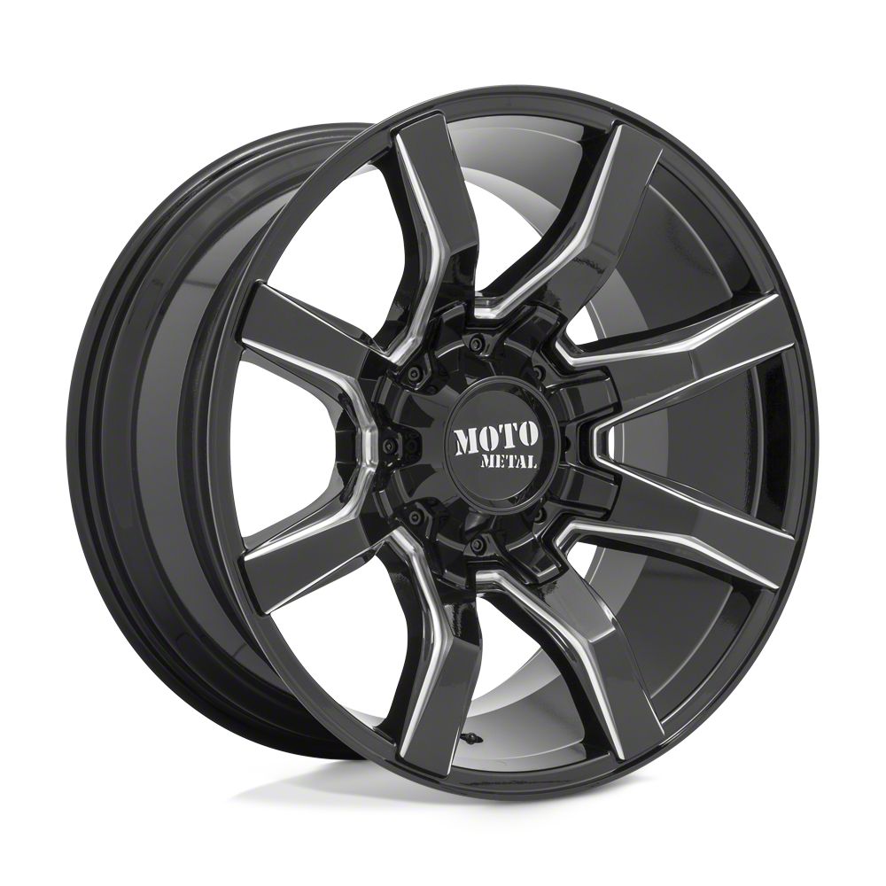 The 20x9 Moto Metal Spider Gloss Black Milled 6-Lug Wheel is completed in a high-quality gloss black finish with steel milled accents that will be the envy of everyone. For added protection and good looks, there is a durable clear coat that withstands the rigors of everyday driving,