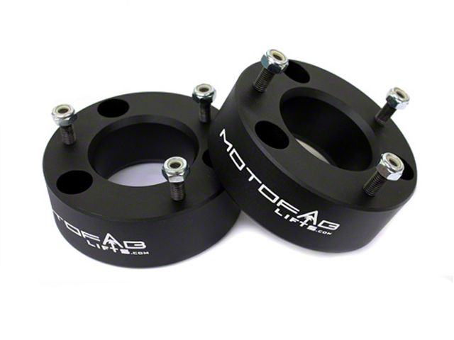 Hassle-Free Leveling Kit. The MotoFab 3 in. Front Leveling Kit is specially designed to provide a true 3 inch rise to your F-150’s front. This makes it ideal to eliminate the nose-down rake from factory and due to heavy equipment and accessories like bumpers and winches. Additionally, the heavy duty strut spacers are a simple and safe way to level your truck and don’t involve any cutting or drilling.
