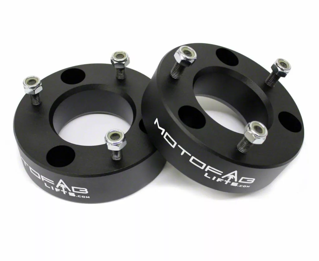 Installation. The MotoFab 2.50-Inch Front Leveling Kit is a direct replacement, making installation simple and straightforward. The kit includes everything you need for installation, including two spacers, installation hardware, and step-by-step instructions. Professional installation is recommended, but the included instructions make it accessible for experienced DIYers to complete the install with ease.