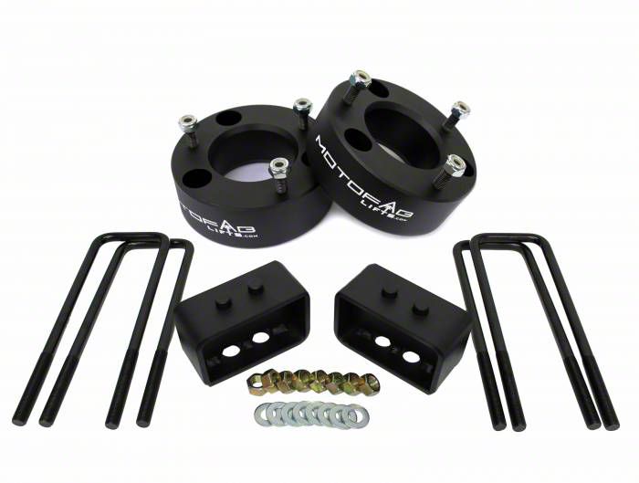 Aggressive Chassis Stance. Designed to lift the front of your vehicle by 3 inches and the rear by 1 inch, the MotoFab Leveling Kit levels out your vehicle, eliminating the factory rake and giving your ride a noticeably aggressive look. The increased clearance provides more room for larger wheels and tires, broadening your choices for customization and allowing for enhanced off-road performance.