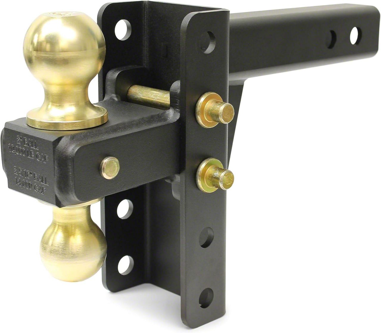 Versatile Towing Solution. The MotoFab 2-Inch Receiver Hitch Adjustable Ball Mount with 2 and 2-5/16-Inch Balls offers an adjustable range from a 4-inch drop to a 4-inch raise in 2-inch increments. This feature allows you to tow multiple trailers using one hitch, making it a versatile addition to your towing equipment.