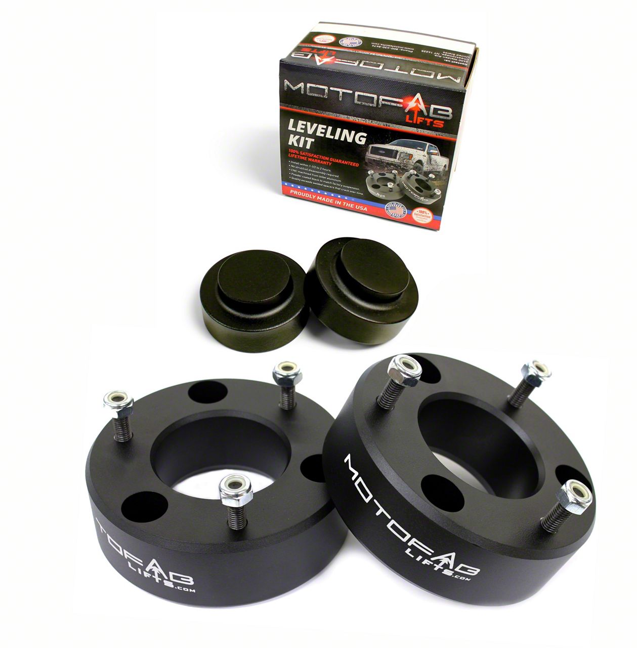Give your Chevy a confident, leveled stance and extra ground clearance—without sacrificing ride quality. This MotoFab front & rear leveling kit adds 2.5" of lift to the front and 1" of lift to the rear, giving your SUV a balanced look and the ability to fit larger, more aggressive tires. Precision-machined components correct the factory nose-down rake, improve approach and departure angles, and keep a factory-like ride.Why you’ll love itTrue, level stance – Raises the front 2.5" and the rear 1" for a clean, even profile.CNC-machined billet construction – Precision fit, excellent durability, and a corrosion-resistant black finish that blends with OE suspension components.Ride quality you can trust – Designed to maintain stock-like comfort and control.Made in the USA – Built in Buffalo, NY and backed by a lifetime warranty.Bolt-on install – Vehicle-specific hardware and step-by-step instructions included. No cutting or permanent mods required.FitmentChevrolet Tahoe: 2007–2020, 2WD/4WDChevrolet Avalanche: 2007–2013, 2WD/4WDGMC Yukon: 2007–2020, 2WD/4WDNote: Not compatible with vehicles equipped with AutoRide/MagneRide adaptive suspension. Lift spacer thickness is not a 1:1 ratio with the final lift height due to factory suspension geometry. A professional alignment is recommended after installation.What’s in the box2.5" Front lift spacers (pair)Rear 1" coil spring spacers (pair)All required grade-rated hardwareInstallation instructionsLevel your Chevy the smart way—clean look, proven materials, and lifetime peace of mind.