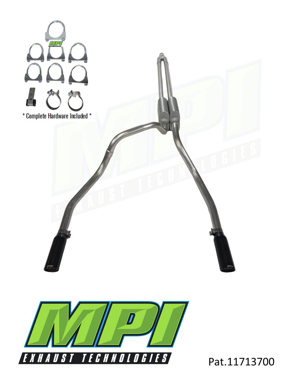 High-Performance Exhaust System. The MPI Exhaust Technologies Turbo Series Clamp-On Dual Exhaust System with Black Tips is engineered to enhance the performance and sound of your vehicle. This cat-back system features a 2.50 inch exhaust tubing diameter, ensuring optimal exhaust flow and increased horsepower.