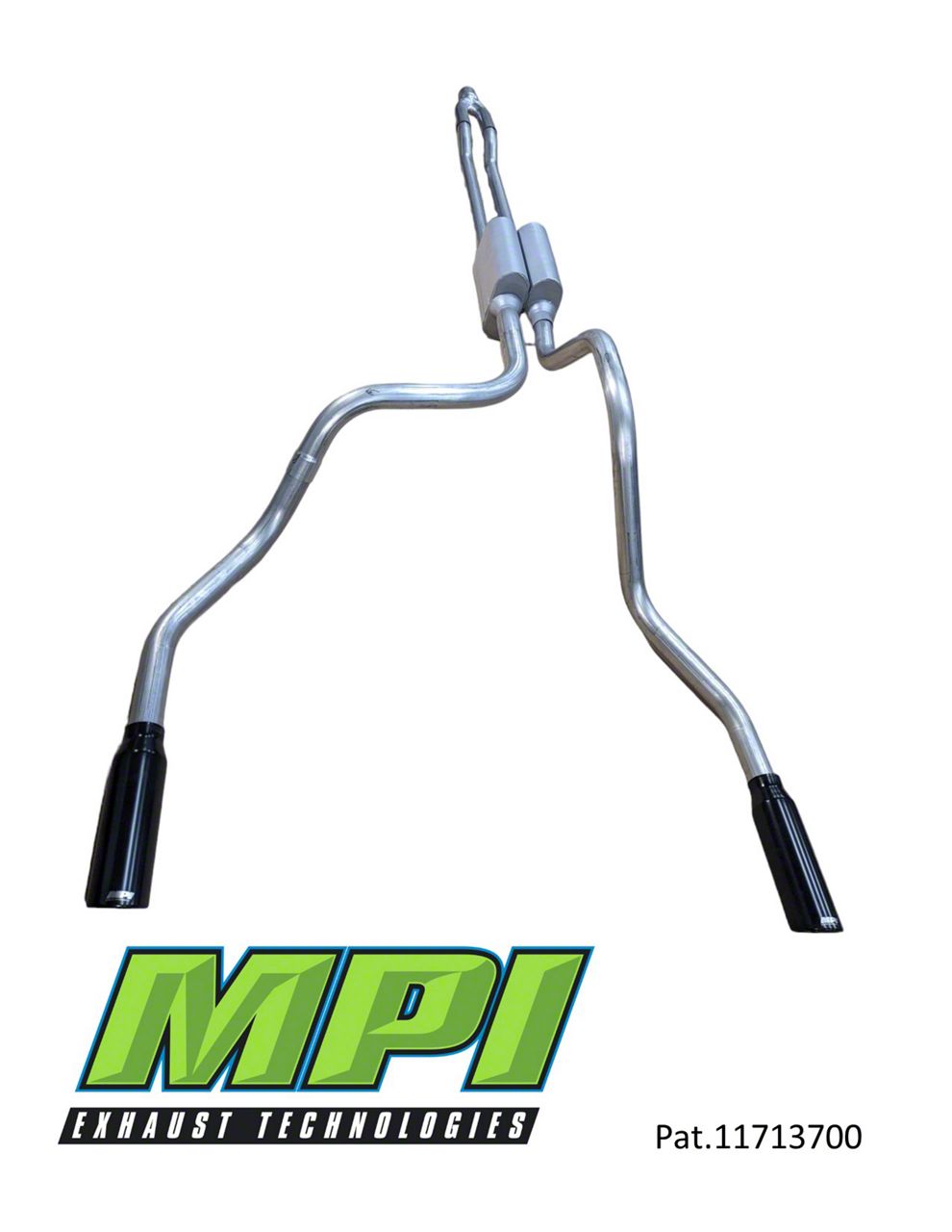 Enhanced Performance. The MPI Exhaust Technologies Turbo Series Clamp-On Dual Exhaust System with Black Tips is designed to optimize exhaust flow and performance significantly. This exhaust system improves fuel economy and produces a mellow sound without in-cab drone, making it ideal for both performance enthusiasts and daily drivers.