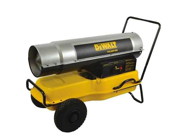 Description. 185,000 BTU Forced Air Kerosene Job Site Heater. DEWALT forced air kerosene heaters are up to the task, whether on the job site, around the farm, or in the workshop. Featuring cold weather starting capability, even in extremely low temperatures you’ll have instant heat. With 185,000 BTUs, quickly and effortlessly heat up to 4,000 sq ft with a factory installed thermostat to maintain a comfortable and warm environment. Designed with a high output, fully enclosed motor, large glove friendly controls, flat-free foam filled tires, and a split upper shell designed for easy maintenance, you can expect long life and faithful service. Keep focus on the task at hand with a high temperature safety shut-off switch and a photo cad cell flame sensor that will shut down the unit in unsafe conditions, while getting the job done with up to 9.5 hours run time on an 13.8 gallon tank.