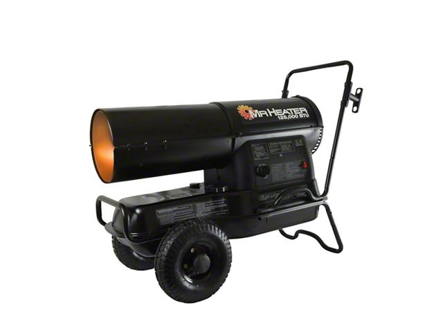Description. Whether you are using it in a garage or on the jobsite, this 125,000 BTU Forced Air Kerosene heater by Mr. Heater is up for the task. With jobsite ready dual powder coated tubular steel handles, pneumatic rubber tires, and a split upper shell designed for maintenance, you can expect long life and faithful service from your Mr. Heater Forced Air Kerosene heater. Equipped with high output fully enclosed motors and large glove friendly controls, you cannot go wrong. Heating up to 3,125 square feet and controlled by a factory installed thermostat, this unit effortlessly heats up a lot of space quickly. Equipped with a high limit safety switch and a photo CAD cell to shut the unit off in unsafe conditions, you can use this heater with no worries and focus on the task at hand. This kerosene heater has all the versatility and safety features the jobsite requires.