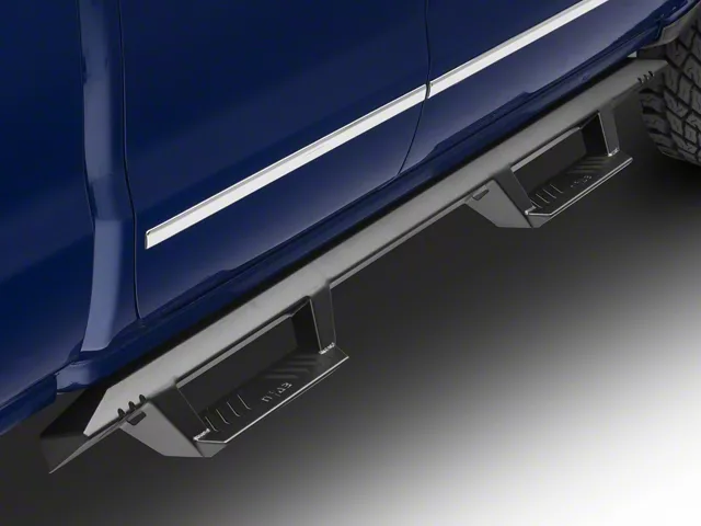Functional Side Step Bars. Never have a problem getting in and out of your Chevrolet Silverado 1500’s cabin with these N-Fab EpYx Cab Length Nerf Side Step Bars; Textured Black. These side step bars feature patented drop-down step design with wide and deep step plates, which ensures safe and reliable access to your truck’s cabin at all times. The step bars are also designed to fit exactly to the vehicle body and feature a rugged black finish that complements the look of an off-road truck.