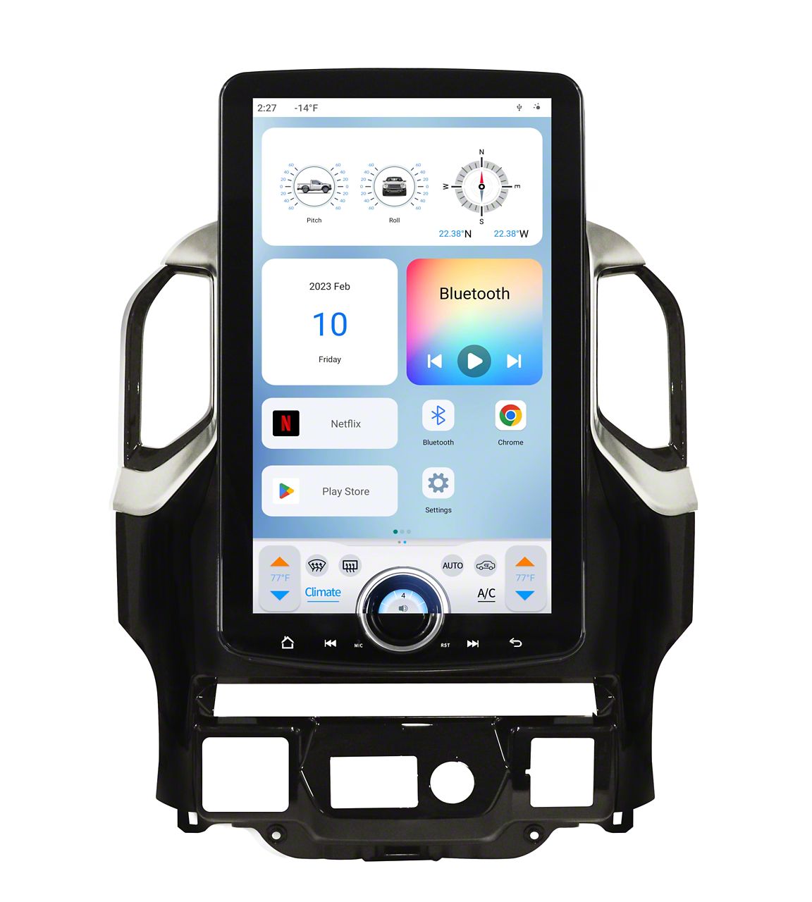 Construction and Appearance. Built around a bright HD touchscreen Android tablet, this radio offers crisp visuals and intuitive touch controls. Its sleek 15.60-inch screen is paired with an innovative on-screen X-KNOB, providing quick access to frequently used functions. The premium construction includes quality materials for durability, while the modern interface ensures a clean, high-tech look inside your truck.