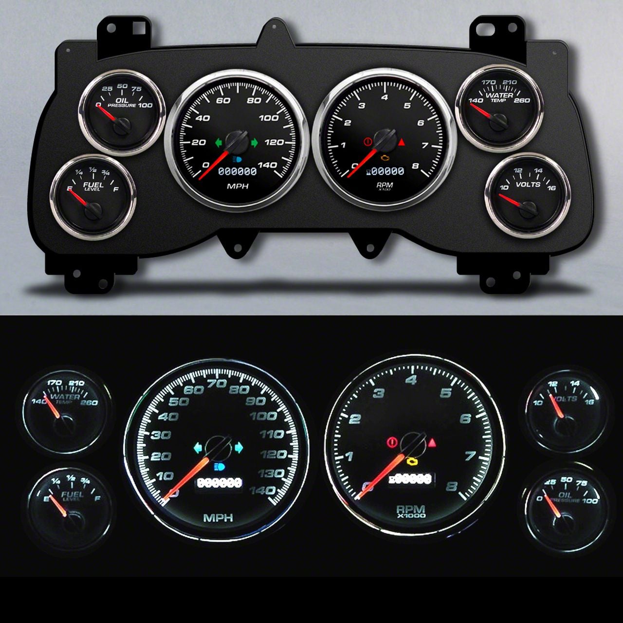 Construction and Appearance. This gauge kit features a black gauge face design with bold white numerals and red pointers for high contrast and easy readability. Constructed using high-grade materials and modern stepper motor technology, it ensures durability and reliable performance. The matte black finish with subtle gloss accents adds a performance-inspired aesthetic to your truck's interior.