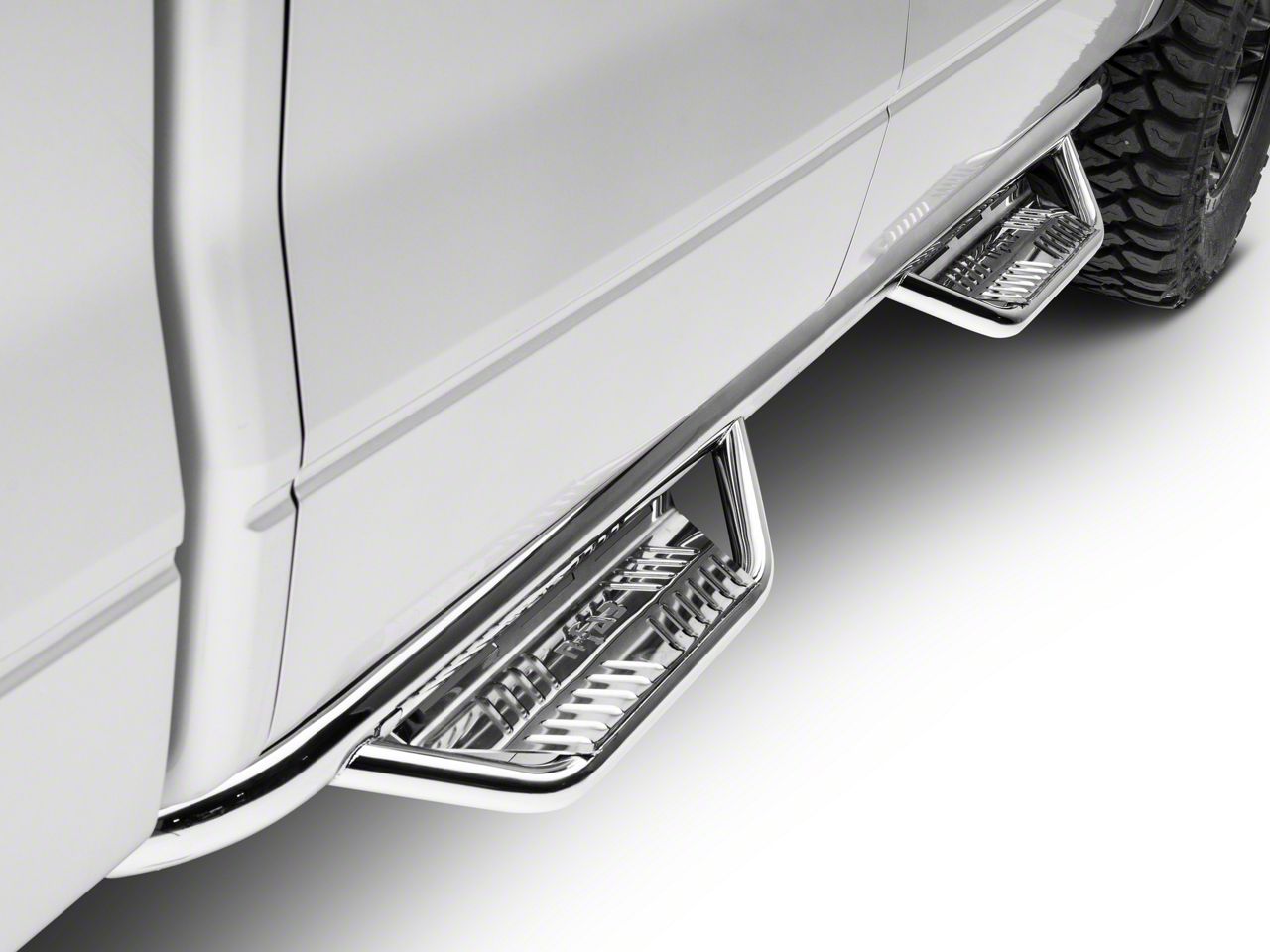High-End Appearance. With a main tube that fits high and tight on your 2009-2014 Ford F-150 SuperCrew's body, N-Fab's Cab Length Podium Nerf Side Step Bars Polished Stainless are the perfect addition to your rig. The clean and modern styling is ideal for both on and off road drives, and the tough cab length design means you'll have full side protection against potentially harmful obstacles that you meet along your route. Best of all, the patented drop-down hoop step design boasts an enclosed sure grip step plate that allows for unbeatable traction and improved safety for you and your passengers in any weather, providing easy, stable access to your rig's cab.