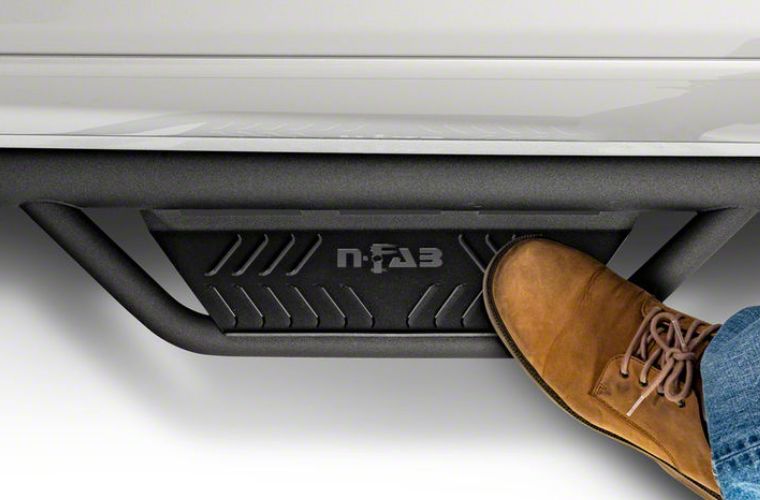 Fully Welded, 1-Piece Construction. The N-Fab Podium Nerf Side Step features a 3-inch main tube made of 0.084 stainless steel, and has a zinc base coat with a textured-black, powder-coat outer finish. This 1-piece welded design prevents cracking and failure under the most challenging driving conditions, and has been tested at an impressive 465 pounds.