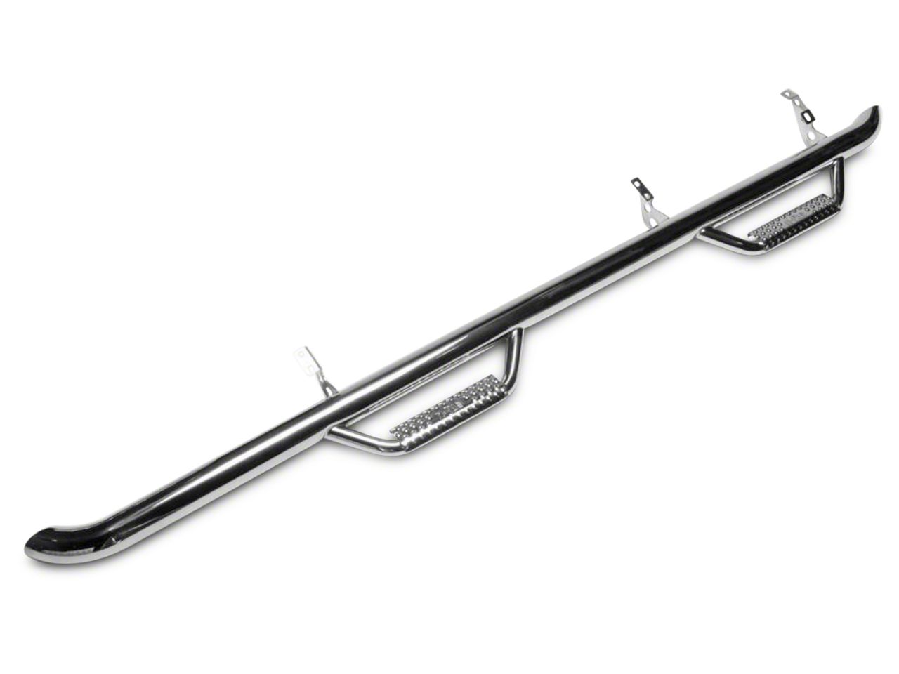Heavy-Duty Nerf Steps with Good Protection. With a weight rating of 465 lbs, the N-Fab Wheel 2 Wheel Nerf Side Steps, Polished Stainless have what it takes to keep you climbing in and out of your 2009-2018 Ram 1500 cab safely and easily – even in less than ideal weather, or with a tall suspension lift. The steps work as rocker panel and lower door protection, too, fending off rocks, stumps, and thrown gravel with their stout tubular stainless steel construction. The slanting sides on the step hoops ensure that that slide over obstacles in most cases, rather than hanging up on them, while the textured step pad surfaces give lots of grip to your footwear even when it’s muddy, wet, or slippery with compacted snow and slush.