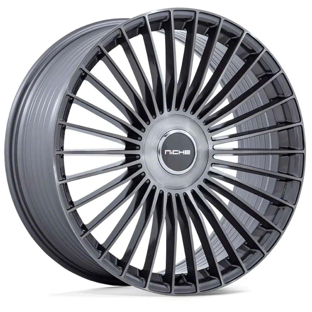 Niche Serene Gloss Titanium Brushed 6-Lug Wheel; 24x10; 30mm Offset is a wheel that stands out with its refined design and precision finish, making it a perfect match for vehicles that demand a sophisticated yet aggressive appearance.