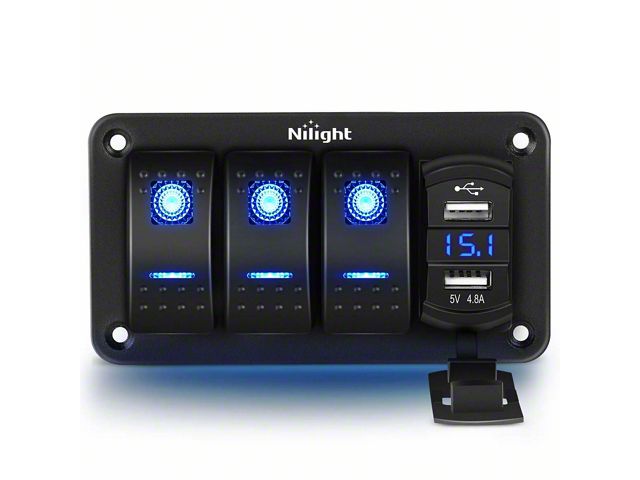 Control and Safety. Introducing the Nilight 3-Gang Rocker Switch Panel with Dual USB Chargers and Voltmeter in Blue - the ultimate control center for your 12V-24V electrical systems. This sleek and durable panel features 3 easy-to-use on/off rocker switches with captivating blue LED lights, making it a stylish addition to your vehicle or boat. Safety is a top priority with this switch panel. It also comes equipped with voltage monitoring to ensure your system's safety, along with short circuit, overload, and overvoltage protection.