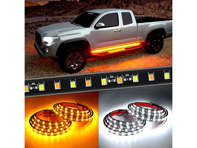 Elevates Your Vehicle's Visibility. The Striking 60-Inch LED Running Board Lights provide exceptional illumination with their 144 high-intensity LED chips. Featuring white courtesy lights, sequential amber DRL/turn signal lights, and amber parking lights, these running board lights ensure your vehicle stands out while enhancing safety on the road.