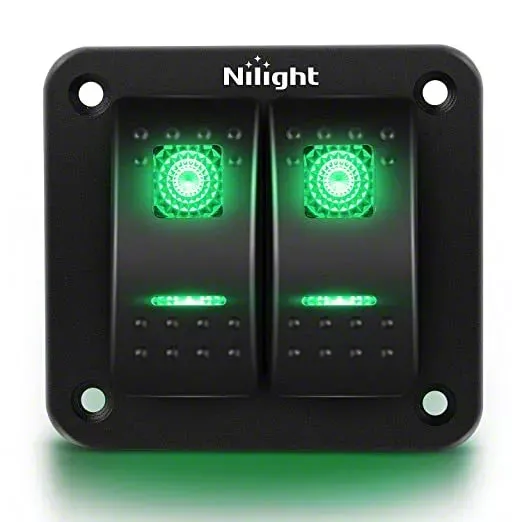 Construction and Appearance. This switch panel features a strengthened aluminum panel that ensures durability and longevity. The switches are made from high-quality ABS plastic, designed to withstand regular use. The Green backlight not only adds to the aesthetic but also facilitates easy operation in low-light conditions. Waterproof and dustproof properties ensure that the panel remains operational in all weather conditions.