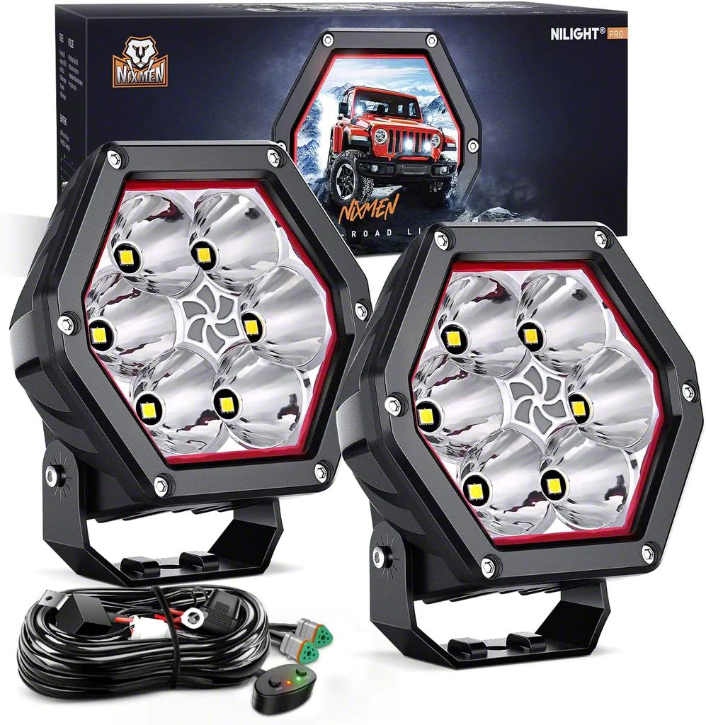 Illuminate Your Journey. Light up the way with the Nilight 4-Inch Hexagon LED Pod Lights, a pair of uniquely designed, hexagon-shaped spot beam lights. Engineered for versatility, these pod lights feature dual light modes, including a powerful main light for clear visibility and a red DRL for enhanced safety and style. The spot beam pattern ensures focused illumination, perfect for navigating through dark terrains.
