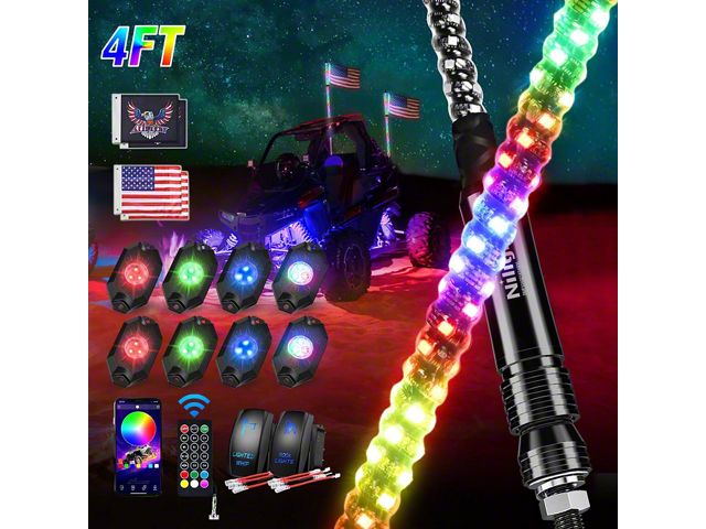 Application. This Nilight Spiral Antenna Bluetooth Remote App Control LED Whip Lights with RGB Rock Lights fits universal applications.