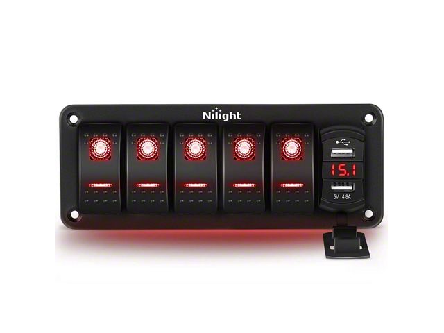 Robust Rocker Switch Panel. Upgrade your vehicle's functionality with the Nilight 5-Gang Rocker Switch Panel, featuring Dual USB Chargers and a Digital Voltmeter, illuminated by striking Red LED backlighting. Universally designed, this panel may require some adaptation for perfect installation but promises to be an invaluable addition to any ride.