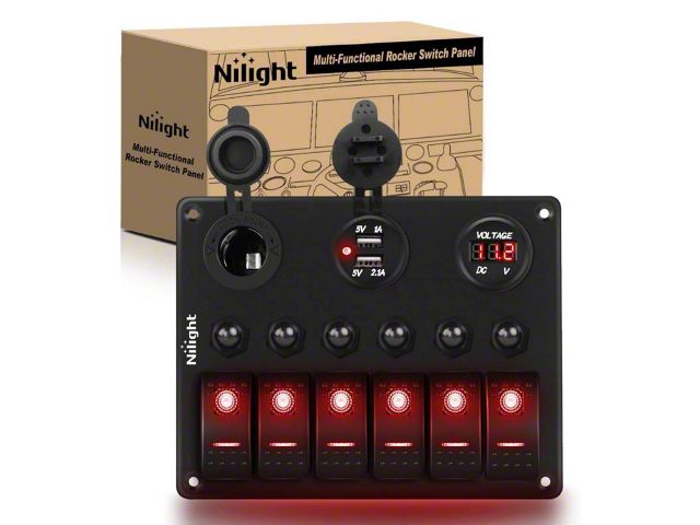 Six-Gang Toggle. Made for a universal fit, this Nilight Rocker Switch Panel comes in a matte black finish with a bright red backlight. Built from heavy duty aluminum, this switch panel includes a digital voltmeter, a cigarette socket, and double 5V 2.1A and 5V 1A USB power charger adapters. Crafted to have 6-gang ABS plastic toggles, this switch panel is a great upgrade for an easy way to control your lights and other appliances.