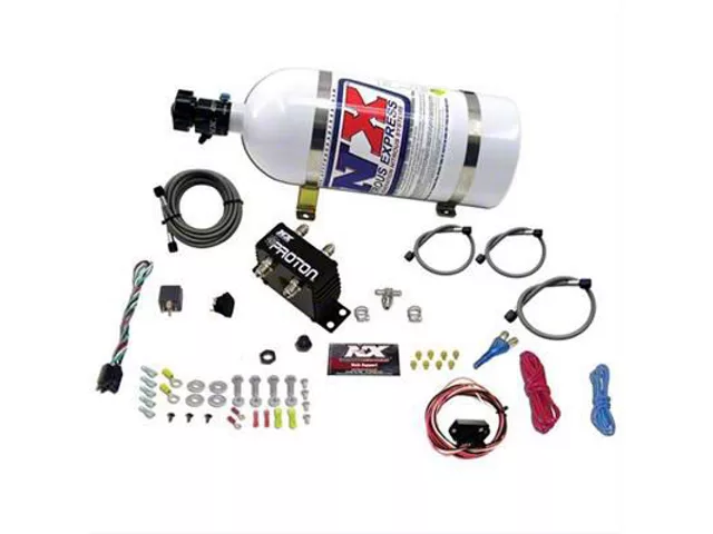 Description. Proton nitrous systems combine performance, durability and value in a compact and easy to mount, made in the USA, nitrous / fuel module. Proton systems now contain a new and improved nitrous / fuel module that is capable of producing up to 250 horsepower to the wheels! The new nitrous / fuel module is extremely durable and is compatible with progressive nitrous controllers. This Proton Plus system includes jetting for 35HP, 50HP, 75HP, 100HP, 125HP and 150HP but can flow up to 250HP with the optional SHO jet kit. This system includes a 10lb nitrous bottle with a high flow billet aluminum Lightning bottle valve, stainless bottle brackets, a single Shark nozzle, nozzle adapter, stainless braided nozzle lines, 15 foot braided stainless feed line, stainless fuel line, master arming switch, wide open throttle switch, 40 amp relay, relay harness as well as every nut, bolt and electrical connector needed to complete the installation. Fits all electronic fuel injected vehicles with a single throttle body. This system includes a TPS Autolearn wide open throttle module for use with all electronic fuel injected vehicles, including those with "fly by wire" electronic driven throttle bodies.