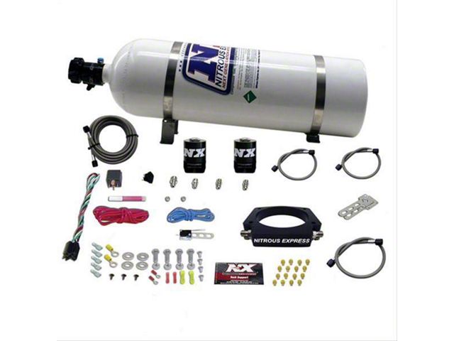 Description. The Nitrous Express LS 102mm Plate System features a billet plate that fits all FAST 102 intakes. This 102mm plate bolts between the throttle body and intake making installation quick, easy and attractive. The system comes as a single stage system and includes jetting for 50, 100, 150, 200, 250, 300, 350 and 400 horsepower. The plate is pre-machined with a second set of nitrous and fuel passages so you can easily upgrade to a dual stage system by adding part # NX933D. This system includes ProPower Lightning series solenoids, 6AN feedline, braided stainless solenoid to plate lines, stainless bottle brackets, master arming switch, WOT switch as well as every nut, bolt and electrical connector needed to complete the installation. This system includes the latest technology and the best components available. NX Lightning solenoids feature an improved flow path that eliminates sharp turns and expansion areas in the nitrous flow path. This keeps the nitrous in dense liquid form which makes more power utilizing less nitrous. Lightning nitrous solenoids feature an integrated purge port which allows you to connect a purge valve directly to the body of the nitrous solenoid for clean looks and less plumbing. Lightning Series solenoids feature CNC aluminum bodies topped with Carbon Fiber cans for the ultimate in weight savings.