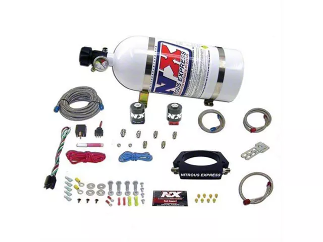 Description. The Nitrous Express LS 102mm Plate System features a billet plate that fits all FAST 102 intakes. This 102mm plate bolts between the throttle body and intake making installation quick, easy and attractive. The system comes as a single stage system and includes jetting for 50, 100, 150, 200, 250, 300, 350 and 400 horsepower. The plate is pre-machined with a second set of nitrous and fuel passages so you can easily upgrade to a dual stage system by adding part # NX933D. This system includes ProPower Lightning series solenoids, 6AN feedline, braided stainless solenoid to plate lines, stainless bottle brackets, master arming switch, WOT switch as well as every nut, bolt and electrical connector needed to complete the installation. This system includes the latest technology and the best components available. NX Lightning solenoids feature an improved flow path that eliminates sharp turns and expansion areas in the nitrous flow path. This keeps the nitrous in dense liquid form which makes more power utilizing less nitrous. Lightning nitrous solenoids feature an integrated purge port which allows you to connect a purge valve directly to the body of the nitrous solenoid for clean looks and less plumbing. Lightning Series solenoids feature CNC aluminum bodies topped with Carbon Fiber cans for the ultimate in weight savings.