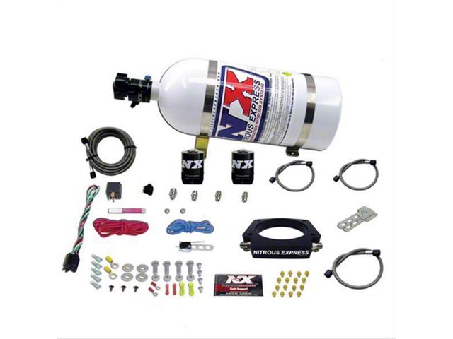 Description. The Nitrous Express LS 90mm Plate System features a billet plate that fits all FAST 102 intakes. This 90mm plate bolts between the throttle body and intake making installation quick, easy and attractive. The system comes as a single stage system and includes jetting for 50, 100, 150, 200, 250, 300, 350 and 400 horsepower. The plate is pre-machined with a second set of nitrous and fuel passages so you can easily upgrade to a dual stage system by adding part # NX933D. This system includes ProPower Lightning series solenoids, 6AN feedline, braided stainless solenoid to plate lines, stainless bottle brackets, master arming switch, WOT switch as well as every nut, bolt and electrical connector needed to complete the installation. This system includes the latest technology and the best components available. NX Lightning solenoids feature an improved flow path that eliminates sharp turns and expansion areas in the nitrous flow path. This keeps the nitrous in dense liquid form which makes more power utilizing less nitrous. Lightning nitrous solenoids feature an integrated purge port which allows you to connect a purge valve directly to the body of the nitrous solenoid for clean looks and less plumbing. Lightning Series solenoids feature CNC aluminum bodies topped with Carbon Fiber cans for the ultimate in weight savings.