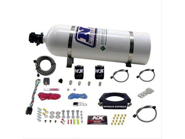 Description. The Nitrous Express LS 90mm Plate System features a billet plate that fits all FAST 102 intakes. This 90mm plate bolts between the throttle body and intake making installation quick, easy and attractive. The system comes as a single stage system and includes jetting for 50, 100, 150, 200, 250, 300, 350 and 400 horsepower. The plate is pre-machined with a second set of nitrous and fuel passages so you can easily upgrade to a dual stage system by adding part # NX933D. This system includes ProPower Lightning series solenoids, 6AN feedline, braided stainless solenoid to plate lines, stainless bottle brackets, master arming switch, WOT switch as well as every nut, bolt and electrical connector needed to complete the installation. This system includes the latest technology and the best components available. NX Lightning solenoids feature an improved flow path that eliminates sharp turns and expansion areas in the nitrous flow path. This keeps the nitrous in dense liquid form which makes more power utilizing less nitrous. Lightning nitrous solenoids feature an integrated purge port which allows you to connect a purge valve directly to the body of the nitrous solenoid for clean looks and less plumbing. Lightning Series solenoids feature CNC aluminum bodies topped with Carbon Fiber cans for the ultimate in weight savings.