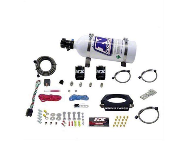 Description. The Nitrous Express LS 90mm Plate System features a billet plate that fits all FAST 102 intakes. This 90mm plate bolts between the throttle body and intake making installation quick, easy and attractive. The system comes as a single stage system and includes jetting for 50, 100, 150, 200, 250, 300, 350 and 400 horsepower. The plate is pre-machined with a second set of nitrous and fuel passages so you can easily upgrade to a dual stage system by adding part # NX933D. This system includes ProPower Lightning series solenoids, 6AN feedline, braided stainless solenoid to plate lines, stainless bottle brackets, master arming switch, WOT switch as well as every nut, bolt and electrical connector needed to complete the installation. This system includes the latest technology and the best components available. NX Lightning solenoids feature an improved flow path that eliminates sharp turns and expansion areas in the nitrous flow path. This keeps the nitrous in dense liquid form which makes more power utilizing less nitrous. Lightning nitrous solenoids feature an integrated purge port which allows you to connect a purge valve directly to the body of the nitrous solenoid for clean looks and less plumbing. Lightning Series solenoids feature CNC aluminum bodies topped with Carbon Fiber cans for the ultimate in weight savings.