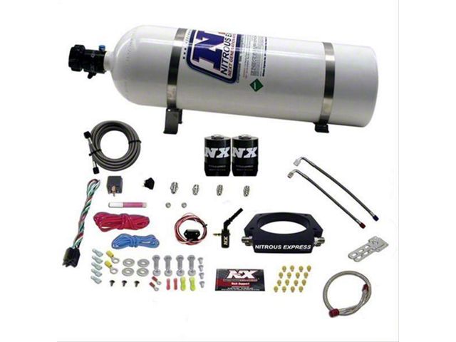 Description. The Nitrous Express 2014-up GM 6.2L nitrous plate system features Spraybarless technology for the ultimate in atomization and distribution. The billet plate bolts between the throttle body and intake making installation quick and easy. The solenoids are integrated into the plate for a super clean look and easy install. A direct-plug-in Fuel Line Adapter is provided to simplify installation (no need to cut your factory fuel lines). This system includes a TPS Autolearn switch so the nitrous only activates at wide open throttle and automatically turns off when you let your foot off the accelerator. The system includes jetting for 35, 50, 75, 100, 125, 150, 200 and 250 horsepower. Systems include a stainless braided N2O line, master arming switch, relay, relay harness and all necessary hardware to complete the installation. Systems ordered with a nitrous bottle include the new billet aluminum Lightning 45 bottle valve and stainless bottle brackets.