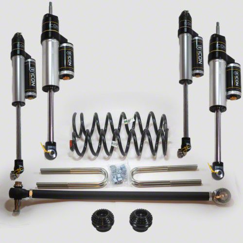 Construction and Appearance. Constructed from high-strength premium-grade components, this kit ensures durability and longevity. It includes ICON Vehicle Dynamics 2.5 Piggyback Shocks, an adjustable trac bar, and low-profile bump stops, all designed to provide a sleek and robust finish to your vehicle.