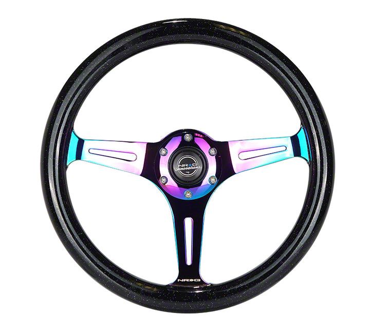 Construction and Appearance. Crafted from high-quality wood, this steering wheel features a polished, glossy finish that enhances both durability and style. The Neo Chrome center spokes provide a vibrant, iridescent look, while the galaxy black accents offer a sleek contrast for a custom and refined appearance.