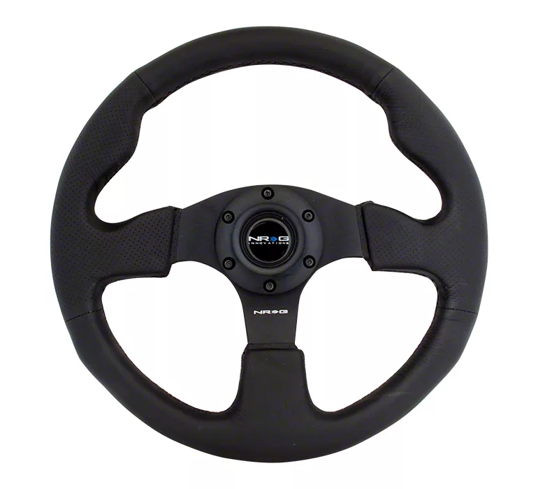 Construction and Appearance. Designed with a three-spoke lightweight aluminum frame, this steering wheel offers the perfect balance of strength and weight reduction. Wrapped in premium black leather with black stitching, it delivers a sleek, high-end look while providing an ergonomic grip for superior control. Its universal fitment allows compatibility with NRG and aftermarket hub adapters for seamless integration.