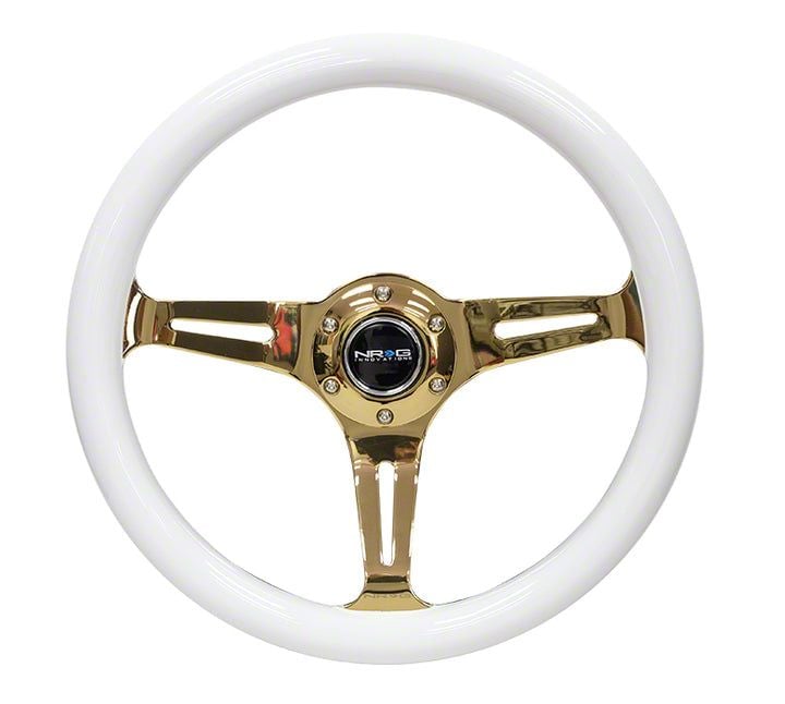 Retro Style with Modern Craftsmanship. Add timeless character to your vehicle interior with this 350mm classic steering wheel featuring a white grip, rich wood grain finish, and bold gold spokes. Designed for style and control, it elevates both form and function, making it ideal for restomods, vintage builds, or personalized interiors.