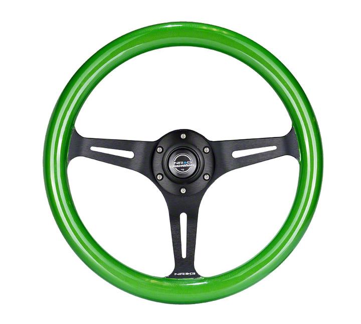 Construction and Appearance. Crafted from high-quality wood grain, the NRG Classic Steering Wheel features a black wood finish with sparkled black spokes. The polished surface adds a sleek touch while ensuring durability. What's more? Its three-spoke design not only looks stylish but also maintains strength and lightweight performance.