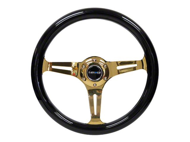 Construction and Appearance. Featuring a glossy black wood grain wheel paired with polished gold finish spokes, this steering wheel delivers an elegant yet bold appearance. Its classic 3-spoke layout and 380mm diameter provide a nostalgic look with modern craftsmanship. Built from high-quality materials, the wheel ensures long-term durability, while adding a stylish focal point to any cockpit.