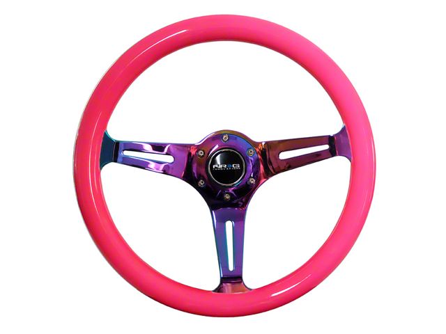 Vibrant Classic Styling Upgrade. The NRG Innovations Classic Wood Grain 350mm Steering Wheel combines vintage-inspired aesthetics with bold modern accents to deliver a one-of-a-kind cockpit upgrade. With its elegant wood grain design and vibrant neochrome and neon pink finish, this steering wheel offers a perfect balance of retro appeal and cutting-edge style. It's built to enhance your driving experience while making a bold visual statement inside your cabin.