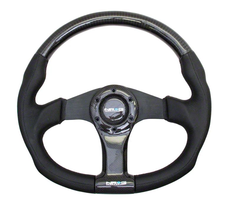 Construction and Appearance. Built with durable, high-quality materials, this steering wheel is made to endure high-stress driving situations. The flat-bottom, oval shape is complemented by a Carbon Black finish, delivering both aesthetic appeal and improved grip during aggressive handling.