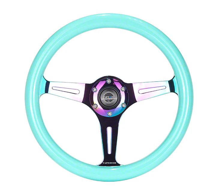 Construction and Appearance. Crafted from premium-grade materials, the NRG Innovations steering wheel features a wood grain finish that enhances both appearance and durability. Furthermore, the Neochrome and Minty Fresh coating adds a unique flair, while the wheel's corrosion- and rust-resistant composition ensures lasting use.