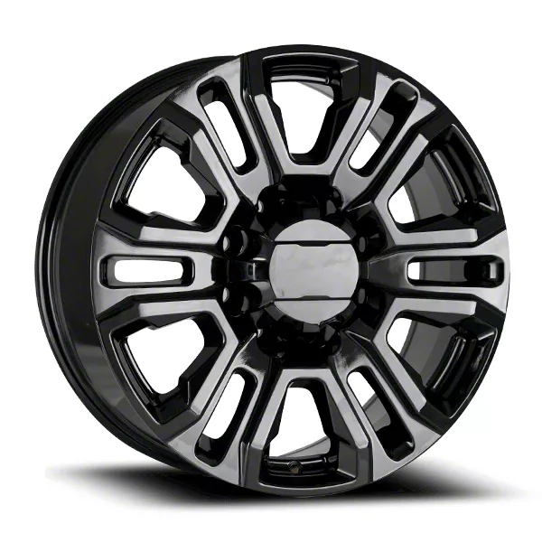 The 20x8.5 OE Concept GMC Sierra HD Denali Replica Gloss Black 8-Lug Wheel; 20x8.5; 15mm Offset is completed in a gloss black finish that will make everyone green with envy. For added protection and good looks, this wheel features a durable clear coat that is tough enough to stand up against the hazards of everyday driving.