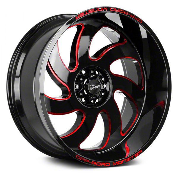 This 22x12 Off Road Monster M07 Gloss Black Candy Red Milled 6-Lug Wheel is completed in a high-quality, distinct candy red finish for an awesome appearance. There's a durable clear coat finish that protects against driving hazards.