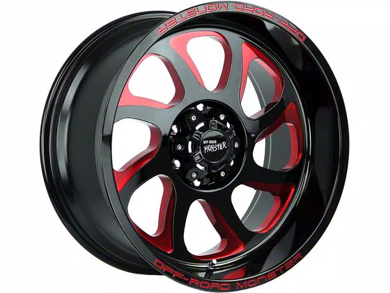 Off-Road Monster M22 Gloss Black Candy Red Milled 6-Lug Wheel; 20x10; -19mm Offset. The Off-Road Monster M22 Gloss Black Candy Red Milled 6-Lug Wheel offers a striking balance of style and refinement. Its unique design accentuates the vehicle's aesthetic, while the premium construction underscores its robust nature. This wheel is a perfect choice for those seeking both elegance and a strong visual statement.