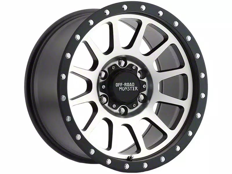 Off-Road Monster M10 Flat Black Machined 6-Lug Wheel; 17x9; 0mm Offset. The Off-Road Monster M10 Flat Black Machined 6-Lug Wheel offers a striking balance of style and refinement. Its unique design accentuates the vehicle's aesthetic, while the premium construction underscores its robust nature. This wheel is a perfect choice for those seeking both elegance and a strong visual statement.